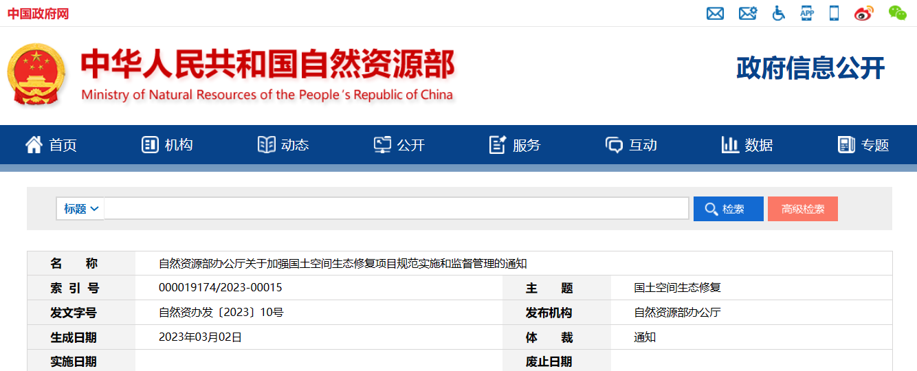 自然资源部办公厅关于加强国土空间生态修复项目规范实施和监督管理的通知