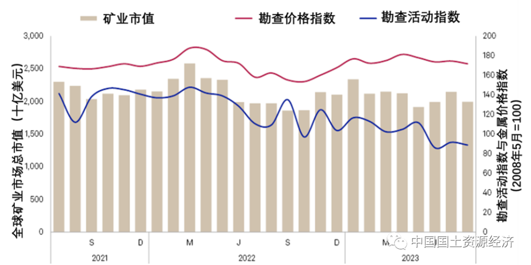 图4 2021年7月—2023年8月全球矿业公司地质勘查活动指数、勘查价格指数及公司总市值变化情况
