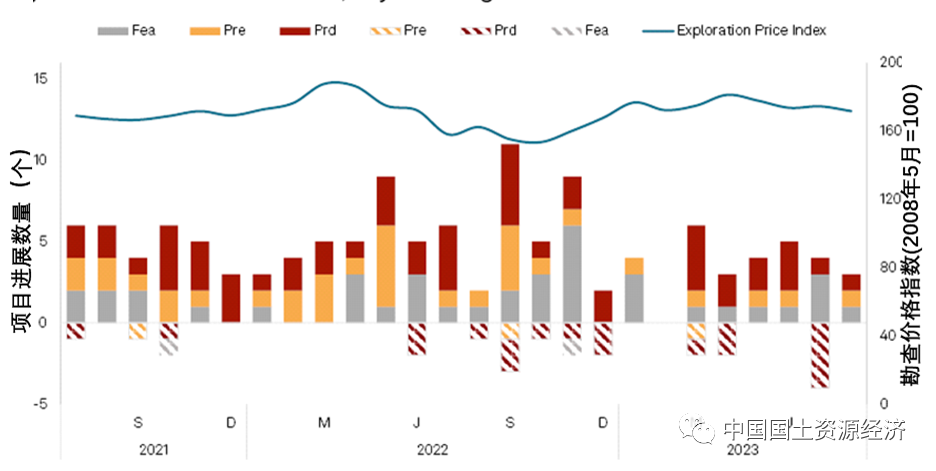 注:图例中Fea为Feasibility,代表项目进入可行性研究阶段;Pre为Preproduction,代表项目进入预生产阶段;Prd指Production,代表项目进入生产阶段。实心图例代表积极项目进展,用正值表示;虚线图例代表消极进展,用负值表示。EPI为勘查价格指数。