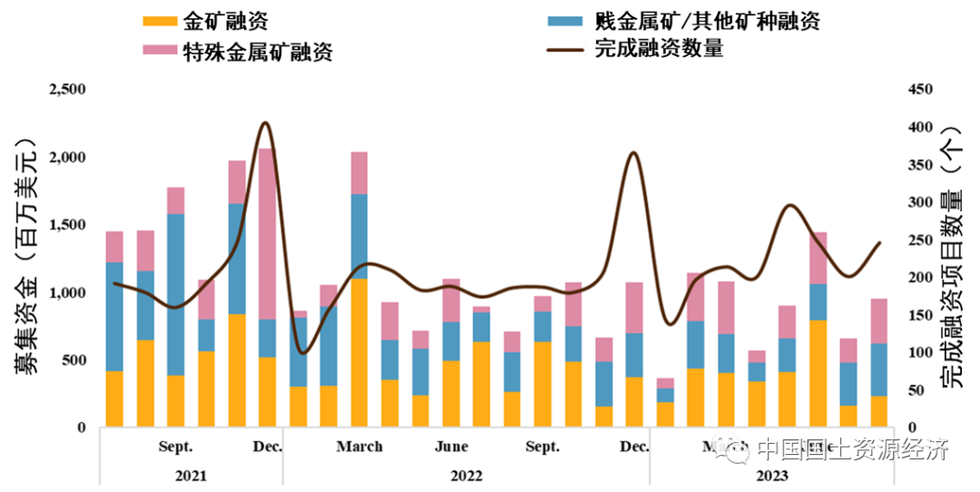 图8 2021年7月—2023年8月全球初级和中级矿业公司融资情况
