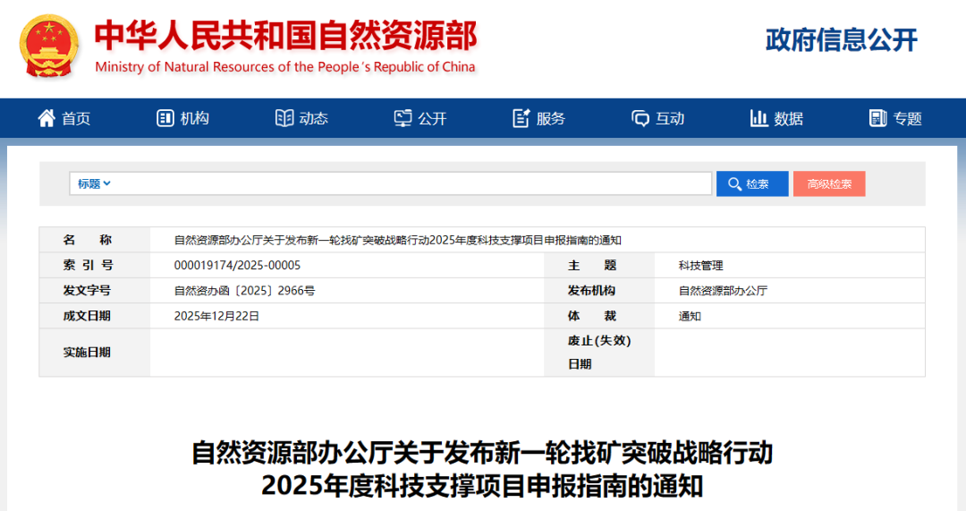 为充分发挥科技创新对矿产勘查的引领作用,进一步破解找矿突破遇到的关键科技问题,我部经广泛征集、专家评审形成《新一轮找矿突破战略行动2025年度科技支撑项目申报指南》(以下简称《指南》)。按照新一轮找矿突破战略行动办公室相关工作安排,现将《指南》予以发布,请根据指南要求组织项目申报工作。有关事项通知如下。